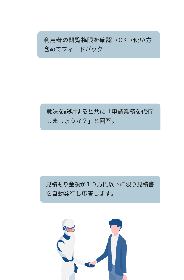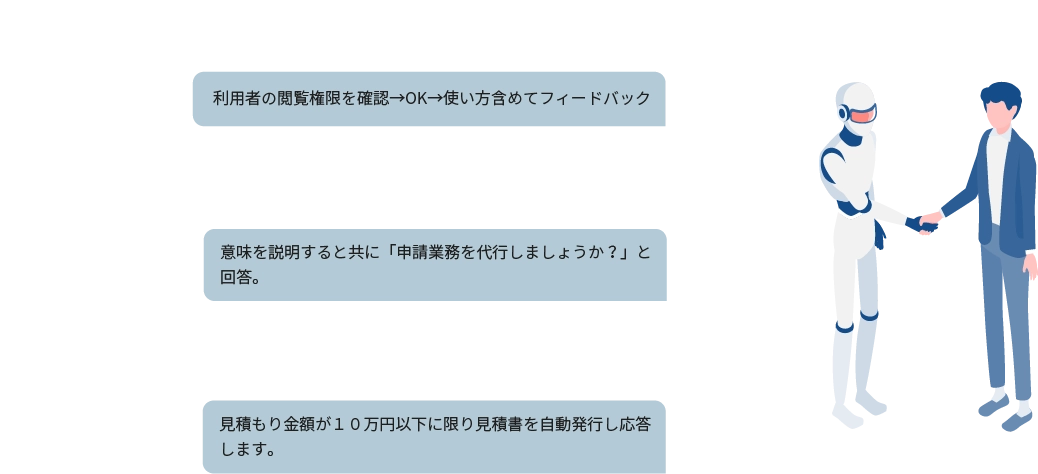 人間に変わって業務遂行するAIを人格生成し提供します。A部長からの指示は即時全実行、B係長からの指示はC部長の許可が必要。R工務店からの依頼は1000万円まで受注可能、V支店からは全件T課長の稟議必要など、手続メモリが御社に蓄積するので最新のAIへの乗り換えが容易。常に最新で最高の知能を持ったAIに自社業務の遂行を依頼可能です。